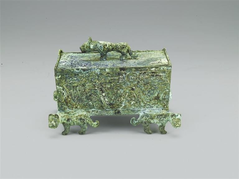 1993年山西省曲沃縣北趙村晉侯墓地62號墓出土。波曲紋虎足方盒為生活用具,出土于晉穆侯夫人墓。盒為長方形,口徑略大于底徑,斜直壁,頂部有立體的虎形捉手,兩扇小蓋可以開啟,盒下有四虎為四足,虎首朝外。盒四壁上部飾鱗紋,下部飾波曲紋。此盒設計精巧,器型較小,紋飾精美,應是古代貴族女性用來珍藏小型物件的容器。