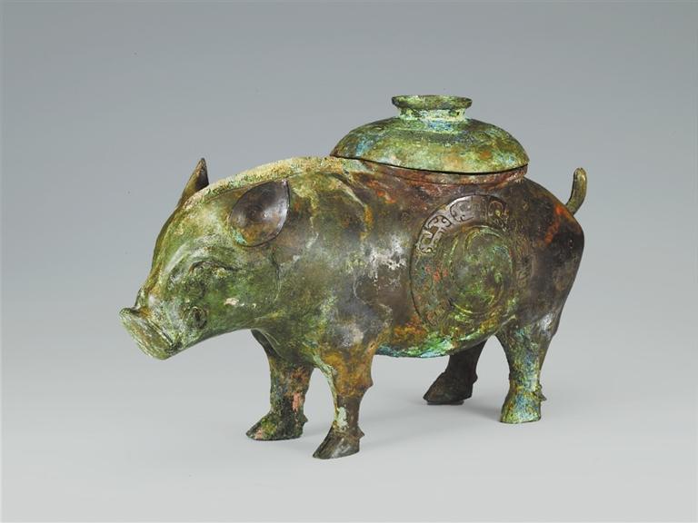 山西省曲沃縣北趙村晉侯墓地113號墓出土。豬尊出土于第一代晉侯燮父的夫人墓中。背上有蓋,蓋面飾云雷紋。器腹兩側各飾同心圓渦紋,周圍飾變形獸面紋。蓋內及外底均有銘文:“晉侯乍(作)旅飤(sì)”。“飤”通“食”,多用于青銅食器上,而此尊應是盛酒器,在酒器上自銘為飤,較為罕見。豬是伴隨著農業(yè)文明的出現而成為最早飼養(yǎng)的動物之一,先秦時期多用作祭祀活動的祭牲。晉侯墓地出土的豬尊,將酒器青銅尊鑄成日常生活中豬的形象,造型逼真,憨態(tài)可掬,工藝精湛,充分體現了青銅工匠的聰明才智。