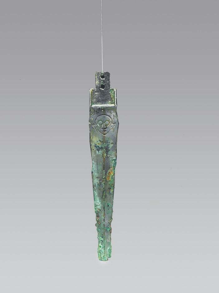 山西省絳縣橫水墓地出土。身呈長條形,中部起脊,兩刃斜直,刃緣鋒利,劍身橫截面呈菱形。莖格部平面呈“凸”字形,有闌,側闌凸起,橫截面呈“工”字形,后端較窄,有兩個圓穿。劍身近莖格處兩面均飾陰線人面紋。雙合范鑄造。兩面人面紋頭頂上方鑄銘文:“楚公逆□□中戈。”考古人員推斷,有可能該件器物的作器者為楚公逆,與晉侯墓地M64出土的楚公逆編鐘、宋代嘉魚縣出土的楚公逆鐘的作器者為同一人。