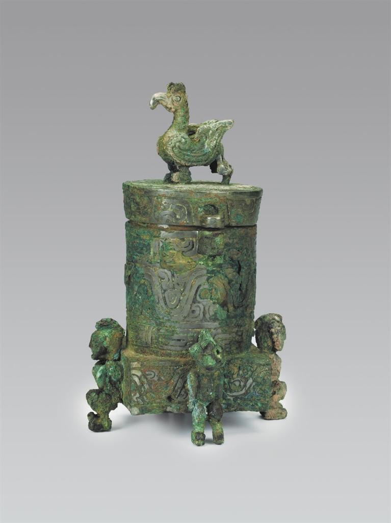 山西省曲沃縣北趙村晉侯墓地63號墓出土。圓筒形,帶蓋,蓋與器體以子母口套合,蓋平頂,上有圓雕立鳥形鈕,鳥彎喙,雙目圓睜,作展翅欲飛狀。器為平口,口沿有一對貫耳,直壁,方形底座,底座四壁各有一個人形足以承器體。人發(fā)髻高聳,赤身裸體,屈膝下蹲,作奮力抬舉器物狀,形象寫實生動。方座飾波曲紋,內底有兩只小鈴,可發(fā)聲。蓋頂飾斜角云紋一周。蓋沿和口沿飾變形獸體紋,筒腹和方座飾波曲紋,筒下層飾鱗紋一周。這種形制的青銅器尚屬首見,其功用還有待于深入研究,但它獨特的藝術造型和裝飾卻可以說是集眾器之長,獨步天下。