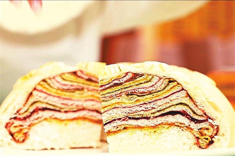 母親最拿手的還是做千層大月餅,做法與平常做饃有點不一樣,發(fā)好面后取適量揉好,切成同樣大小的若干份并搟壓成長方形的薄面皮。一層薄皮一層餡,餡料與烙的糖饃有的不一樣,重在色澤,每層分別抹上姜黃、紅曲、苦豆(香豆)粉、芝麻、菜籽油、糖玫瑰、葡萄干,黃、紅、黑、綠相間,一層黃一層綠一層紅一層黑,一層白糖一層紅糖一層玫瑰糖,一層一層摞好,做成一個六七層的圓餅。最后用薄皮蓋住一摞摞面皮,餅邊捏緊捏好后壓花塑形,表面用模型壓花,用專用做飯梳子一行行點上,或一行白鷺上青天,面皮如一塊畫布,精雕細(xì)琢,怎么好看怎么做,做得隨心所欲又精心設(shè)計。還會刷姜黃與菜籽油拌好的油料,撒上芝麻粒和葡萄干,一個千層餅就基本成型了。
