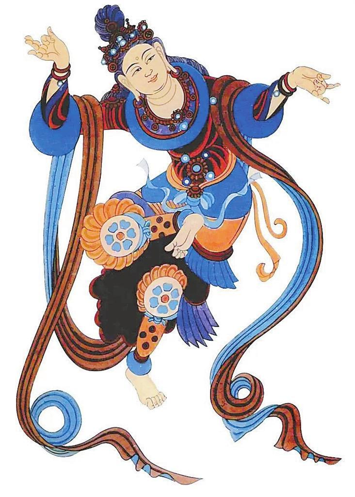 敦煌莫高窟,窟窟有壁畫(huà),拼接起來(lái)長(zhǎng)達(dá)45000多平方米,有世界上“最大畫(huà)廊”之稱(chēng)。這些壁畫(huà)中,幾乎每幅都有舞蹈形象,如在窟頂、龕楣、藻井遨游的飛天,憑欄上的天宮伎樂(lè),經(jīng)變畫(huà)中的娛佛、敬佛的獻(xiàn)舞者——伎樂(lè)天,出行圖中跳著具有濃郁生活氣息的世俗樂(lè)舞,以及富有舞蹈美感的彩塑菩薩、天王力士等,琳瑯滿(mǎn)目,精妙絕倫。這些舞蹈形象充分反映了從十六國(guó)北朝至元代千余年來(lái)不同歷史時(shí)期的舞蹈服飾、形態(tài)、風(fēng)貌,為我們挖掘、整理、弘揚(yáng)中華民族舞蹈文化提供了十分珍貴的形象資料。