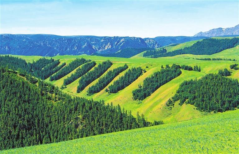 站在山頂一處觀景平臺,放眼四周,滿目蒼翠,層巒疊嶂。祁連云杉環(huán)繞半山腰,山杏、樟子松、沙棘等樹木縱橫成行,微風(fēng)拂過,綠浪涌動。