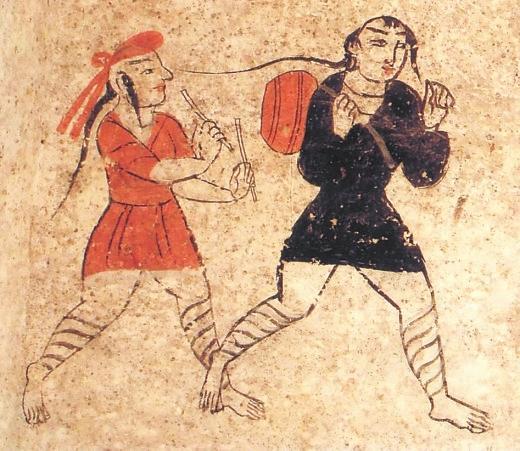 除此之外,河西彩繪壁畫磚圖像中,還有一些反映娛樂的圖像,主要有樂舞圖和六博圖。高臺地埂坡壁畫中的“角抵百戲”中,一著辮者在作表演,他小腿部網(wǎng)狀綁腿,蹲踞,雙手攤開,似乎是在表演魔術(shù),又似乎是在歡迎到場的人們。“擊鼓”中,兩人網(wǎng)狀繃腿,髡發(fā)梳辮,著黑裝者背鼓,著紅裝者持雙鼓槌準備擊鼓。孫機先生謂,戰(zhàn)國迄漢盛行六博,博具和博戲的圖像在考古資料中不乏其例。甘肅以武威磨嘴子漢墓出土木六博俑為例。六博俑以簡單明確的藝術(shù)造型,刻畫了兩個老者全神貫注博弈的場面,惟妙惟肖地表現(xiàn)出對弈時蓄勢待發(fā)的場面。在高臺壁畫墓中的博戲場面略有不同,二博者戴船形帽,打手勢。從相貌看,很可能是少數(shù)民族。高臺出土彩繪壁畫磚上,兩人動作幅度更大,左邊一人的黃紅色著裝和博具上的零散物品,顯得場面更為熱烈激情。