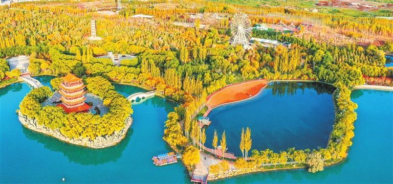 玉門市玉澤湖公園湖水澄澈,絢麗多彩。新甘肅·甘肅日報(bào)記者 馮樂凱