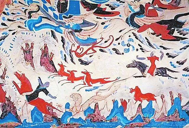在莫高窟第249窟壁畫中有一幅“行獵圖”:畫面上都是些體型巨大的動物,有體態(tài)矯健的猛虎、疾馳俊逸的鹿群、整裝待發(fā)的獅子等,有在奔馳的駿馬上拈弓搭箭窮追不舍的獵人,還有在飛奔的駿馬上淡定轉(zhuǎn)身從容射虎的獵人。整個畫面既緊張又美好,使人不由得對畫師精湛的技藝心悅誠服。唐代詩人王維在詩作《觀獵》中寫道:“風(fēng)勁角弓鳴,將軍獵渭城。草枯鷹眼疾,雪盡馬蹄輕。忽過新豐市,還歸細(xì)柳營。回看射雕處,千里暮云平。”意思是說將軍的獵騎,飛馳在渭城的近郊。風(fēng)中傳來呼嘯的弦聲。已枯的野草,擋不住尖銳敏捷的鷹眼,積雪后飛馳的駿馬馬蹄會愈加輕盈。據(jù)文獻(xiàn)記載,唐宋時期人們打獵時多有一種“西北望,射天狼”的豪情!在莫高窟第85窟壁畫中還有一幅“行獵圖”就形象地反映了唐人狩獵的情景:畫面上的四個健碩獵人正在整裝出獵,他們著裝統(tǒng)一:頭戴幞頭,身穿缺胯衫,足蹬半腰靴。打獵的裝備也很不同:有人胳臂上架鷹、有人單手牽犬、有人持弓挎箭囊,甚至還有一人手持利斧。