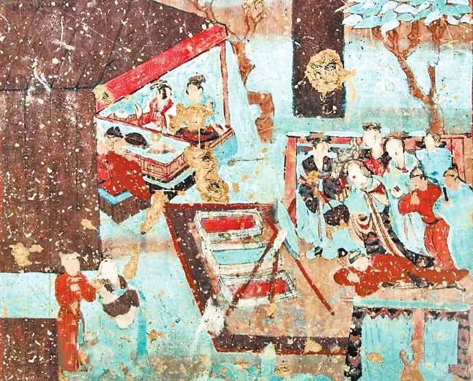 古人會在一年的歲末舉行一次集體聚會,稱作“建福”。在敦煌文獻(xiàn)《社司轉(zhuǎn)帖》中寫道:“右緣常年建福一日,人各爐餅壹雙,凈粟壹斗。幸請諸公等,帖至限今月廿二日卯時于安家酒店取齊。”意思是說,只要有可能,每年到了年末大家都要選擇一日來進(jìn)行建福。每家每戶需要按時把準(zhǔn)備建福的物資送過來。唐朝詩人李白在《客中行》一詩中寫道:“蘭陵美酒郁金香,玉碗盛來琥珀光。但使主人能醉客,不知何處是他鄉(xiāng)。”意思是說蘭陵美酒甘醇甜美,就像郁金香一樣芬芳四溢。興來盛滿玉碗,泛出琥珀光晶瑩迷人。主人端出如此好酒,定能醉倒他鄉(xiāng)之客。飲酒之后哪能分清故鄉(xiāng)與他鄉(xiāng)呢?歲暮聚飲蘊含有辭舊迎新、攘兇納吉的美好愿望。在莫高窟第12窟壁畫中有一幅“帳篷酒肆圖”:畫面中圍坐在條形長桌兩邊正盡興暢飲的客人為七人,還有兩個熱情忙碌的服務(wù)人員。整個畫面是一幅酒酣耳熱、興致高昂的歡飲圖。更為氣勢恢宏、熱鬧非凡的是莫高窟第23窟壁畫中一幅“院落圖”:畫面中分院落之內(nèi)與院落之外兩個部分,院落之內(nèi)是世俗的世界,畫面上布局著鱗次櫛比的廳堂房屋,有人正在庖廚、有人正在對弈、有人正在暢聊、有人正在團(tuán)聚,也有人正在說教,總之表現(xiàn)的是我們?nèi)粘I畹陌賾B(tài)。院落之外是佛國世界,整體呈現(xiàn)出肅穆莊嚴(yán)之感。有趣的是在佛國與世俗世界中間,畫的是服飾艷麗,騎馬遠(yuǎn)行的人們。