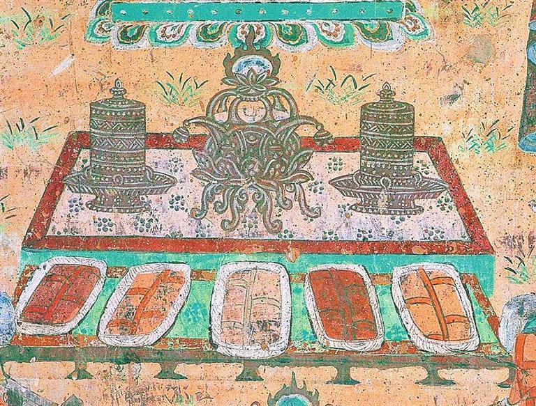宋朝詩人陸游在《食粥》一詩中寫道:“世人個個學(xué)長年,不悟長年在目前。我得宛丘平易法,只將食粥致神仙。”意思是說人人都期盼長壽,怎么也沒有想到,我就成了長壽之人。如果讓我總結(jié)一下我長壽的秘訣,那就是我喝的粥多而已。想想冬天到了,天寒地凍,喝碗粥,渾身上下暖烘烘的多美啊??墒窃诙鼗捅诋嬂铮藗冊诙静皇呛戎?,而是喝熱牛奶。在莫高窟第146窟壁畫中有一幅“擠牛奶圖”:畫面上一頭健碩的母牛正在被人擠奶,它回首望向擠奶者。在它的身下,還有一只小牛犢正貪婪地望著擠奶者。兩頭牛都憨態(tài)可掬、萌蠢可愛。漫天飛雪中,煮沸的牛奶溫暖著漫長冬季的每時每刻。在莫高窟第302窟中有一幅“湯水浴圖”。湯水就是溫泉。畫面上在樹木掩映之下有一池溫泉,有一大一小兩個人正沉浸在溫泉沐浴的歡快之中??梢?,伴著紛飛的大雪泡個溫泉,不是只有今天才有的享受;在千年之前的敦煌,人們就已經(jīng)開始修建溫室浴池,而且引水排水的技術(shù)已經(jīng)較為完善。院落依依、親朋融融、池水湯湯、筋骨軟軟,逸興悠悠。