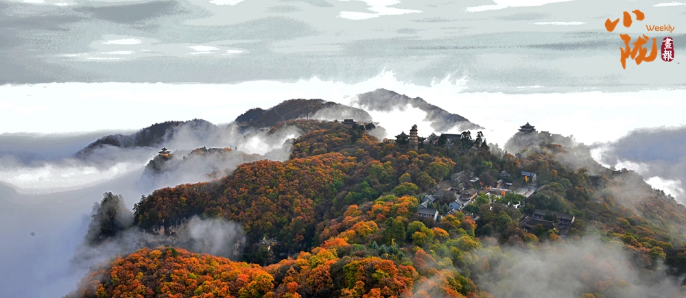 一葉知冬,遍地金黃。五彩斑斕的林木與古香古色的建筑、遠(yuǎn)處的山巒云霧相映成趣,盡顯詩(shī)意之美。