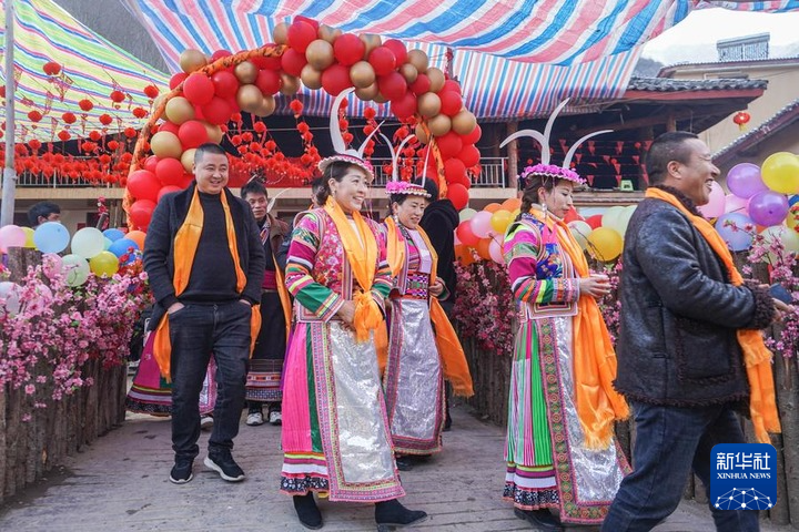 2022年1月13日,在隴南市文縣鐵樓藏族鄉(xiāng)寨科橋村,婚禮宴席結束后賓客到村寨中走親訪友。新華社記者 郎兵兵 攝
