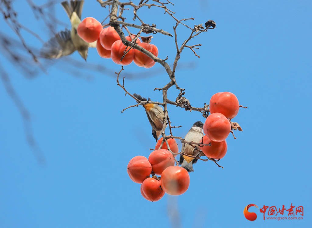 繁華落盡,枝條上一簇簇、一叢叢火紅的柿子在微風(fēng)中搖曳,吸引麻雀前來“聚餐”。麻雀們時而啁啾歡唱,時而蹦跳覓食,小巧的身影與柿子交織在一起,勾勒出一幅生動的冬日畫卷。