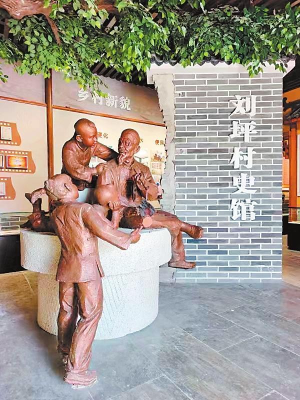 年復(fù)一年的寒來暑往中,大榆樹,也就成了劉坪村的望鄉(xiāng)臺。每個村莊,都有它的望鄉(xiāng)臺,它承載著人們共同的記憶,是人們重溫鄉(xiāng)愁的地標(biāo),永遠(yuǎn)鐫刻在人們的心底。2000年,電視劇《黃沙下面是沃土》的劇組來到劉坪村拍攝取景,村里的望鄉(xiāng)臺大榆樹被拍進電視劇畫面。在劉坪村村史館布設(shè)中,專家和學(xué)者數(shù)易村史館方案,最終確定在村史館正門之內(nèi)塑造一組雕塑,意思是由一位老人講述劉坪村的村史,作為村史館的題眼,村史館內(nèi)還陳列了《劉坪村志》,分為建置、地理、村落文化、風(fēng)土人情等14卷,共40萬字。館內(nèi)能播放劉坪村村史專題片《耕讀傳家》。