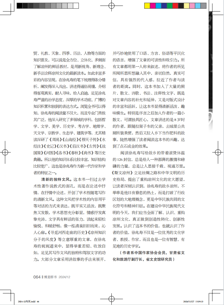 豐富的知識體系。這本學術性隨筆集,是徐兆壽近20年來教學、研究的成果體現(xiàn),不但學術性強、抒情性濃,而且知識面廣,既有歷史、政治、文化、藝術等方面的內容解讀,又有民風、民俗、家訓、家教等方面的常識介紹,還有民居、服飾、飲食、農耕、商貿、禮教、天象、四季、歷法、人物等方面的知識普及,可以說是全方位、立體化、多側面了解涼州的鮮活教材,是用新視角、新理念、新手法詮釋涼州文化的最新讀本。如此豐富多彩的內容呈現(xiàn),在徐兆壽的筆下梳理得條分縷析,闡發(fā)得深入淺出,講述得通俗易懂,介紹得客觀真實,耐人尋味,給人啟迪,足見徐兆壽嚴謹?shù)闹螌W態(tài)度、深厚的學術功底、廣博的知識積累和獨到的表達方式。瀏覽全書可以得知,徐兆壽的閱讀量不僅大,而且專業(yè)門類極其廣泛,他深入研究了多領域的學科,包括哲學、文學、美學、歷史學、考古學、地理學、天文學、宗教學、生態(tài)學、建筑學等,尤其精讀深研了《周易》《山海經(jīng)》《穆天子傳》《水經(jīng)注》《史記》《漢書》《后漢書》《左傳》《戰(zhàn)國策》《河圖》《洛書》《春秋》《尚書》等歷史典籍。所以他的知識體系比較豐富,知識結構比較寬廣,這也是徐兆壽作為新一代作家和學者的特征之一。