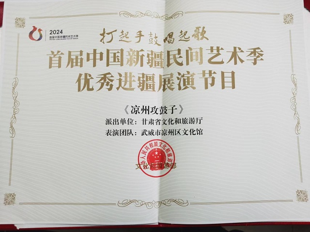 今年8月,文化和旅游部舉辦首屆中國新疆民間藝術(shù)季,《涼州攻鼓子》代表甘肅省參加首屆中國新疆民間藝術(shù)季群眾文化活動開幕式演出,并在烏魯木齊市、石河子市進(jìn)行了多場巡回展演,其獨(dú)特的表演風(fēng)格和深厚的文化內(nèi)涵,為觀眾呈現(xiàn)了一場又一場視聽盛宴,不僅展現(xiàn)了甘肅人民的英勇與豪邁,也讓更多人領(lǐng)略到了甘肅非遺文化的非凡魅力。
