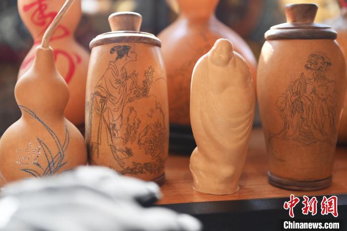 2月8日,甘肅省蘭州市城關(guān)區(qū)“非遺年貨購(gòu)物月”活動(dòng)現(xiàn)場(chǎng)展出的刻葫蘆文創(chuàng)產(chǎn)品。 中新社記者 李亞龍 攝