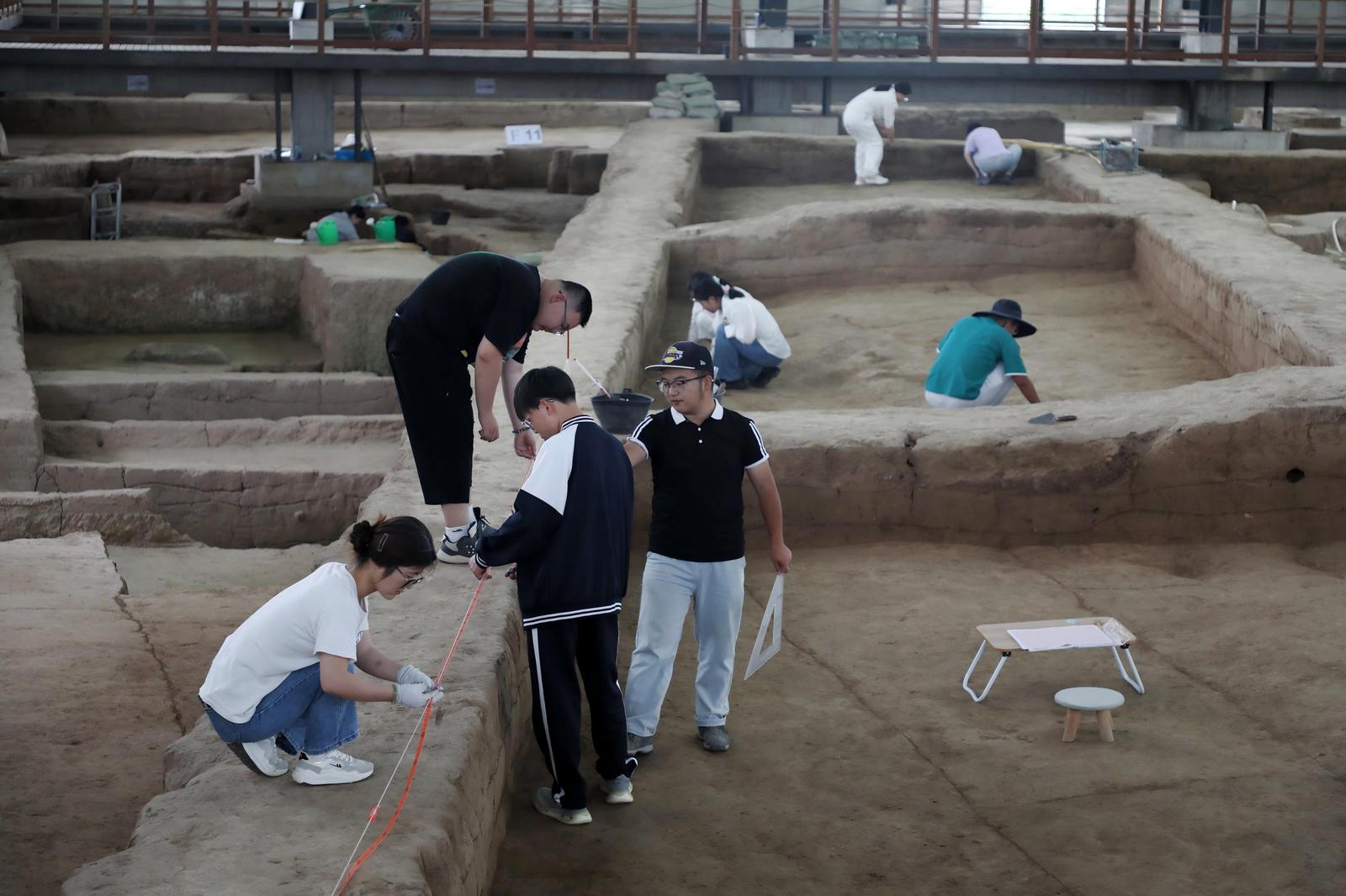 不遠(yuǎn)處,另外幾名學(xué)生也在各自負(fù)責(zé)的探方內(nèi)忙碌著,畫線、找邊、測量、繪圖,他們用手中的工具,在土層中探尋著慶陽文明脈搏的古老印記。