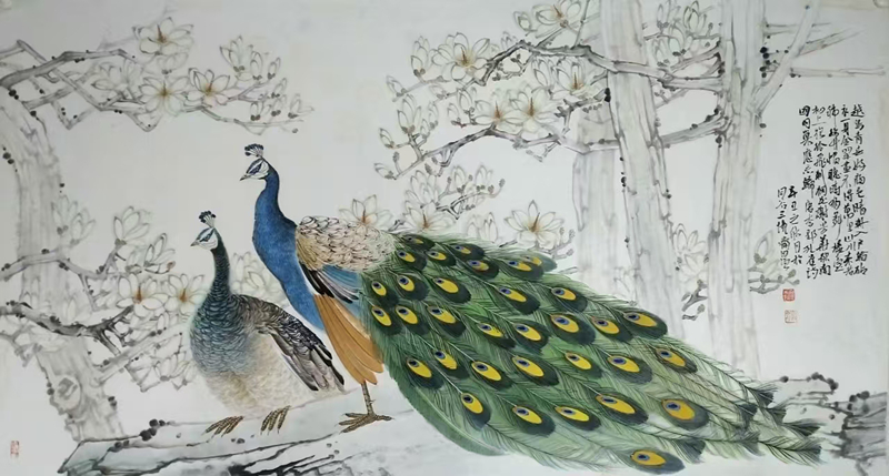 近年來,王自強(qiáng)的創(chuàng)作逐漸從具象走向意象。他嘗試將工筆畫的細(xì)膩與隸書的厚重結(jié)合,在《荷塘清韻》等作品中,荷葉的墨色層次與書法的線條韻律相互映襯,形成“書畫同源”的藝術(shù)境界,這種對(duì)書法藝術(shù)的探索精神不僅得到業(yè)界認(rèn)可,而且得到了社會(huì)的廣泛認(rèn)同。