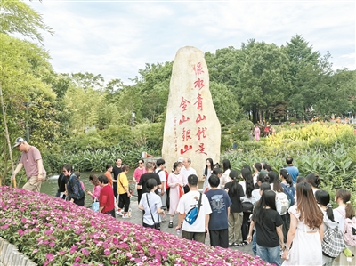 20年來,在綠水青山就是金山銀山理念的指引下,浙江省安吉縣余村努力修復(fù)生態(tài),發(fā)展生態(tài)旅游,探索出一條環(huán)境保護(hù)與經(jīng)濟(jì)發(fā)展相協(xié)調(diào)的新路。游客正在“綠水青山就是金山銀山”石碑前拍照留念。