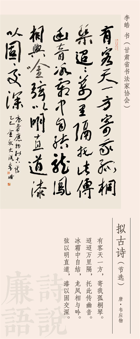 韋應(yīng)物是中唐著名詩人,以恬淡沖遠(yuǎn)的山水田園詩在中國詩歌史上占有一席之地。他出身于豪門,當(dāng)時諺語云:“城南韋杜,去天尺五。”唐代的長安城韋氏和杜氏家族都是出了許多高官的大家族。韋應(yīng)物年輕時不思進(jìn)取,縱情聲色,無所作為。遭逢安史之亂后,他幡然悔悟,發(fā)奮讀書,考中進(jìn)士。進(jìn)入仕途,曾在朝廷幾個部門做過小官,也曾多次外放地方,做過洛陽縣丞、河南府兵曹參軍,當(dāng)過高陵、鄠縣、櫟陽三個縣的縣令,任過滁州、江州、蘇州三個州的刺史。長期的基層任職,讓他深刻體會到民生疾苦,體驗了基層官場生態(tài),從而成為一個體恤民力、剛直廉潔、勤政愛民的父母官。這在他的詩中多有體現(xiàn)。這首擬古詩就反映了他的高潔節(jié)操。