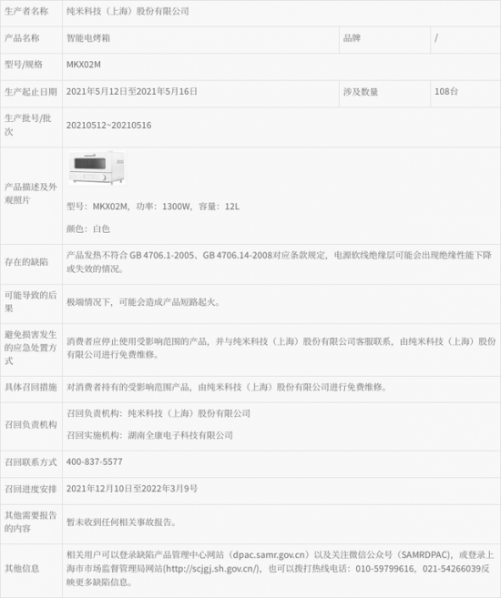 據上海市市場監(jiān)督管理局網站2021年12月9日消息,純米科技(上海)股份有限公司召回部分智能電烤箱。