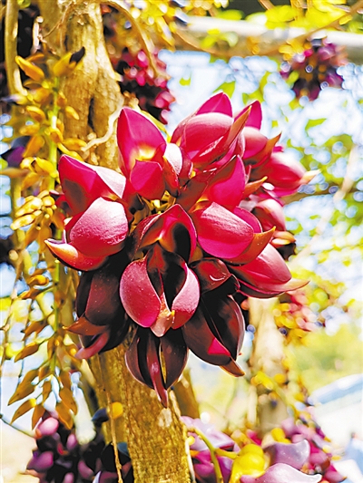我終于登上山巔,來(lái)到那個(gè)罕見(jiàn)的常春油麻藤家族旁邊,眼前的景象,比我想象的更震撼。傷痕累累的蒼勁老藤猶如飛龍騰空而起,盤旋而上。只是,眼前的飛龍,是一條掛滿鮮花的飛龍。成千上萬(wàn)的花朵,密密麻麻包裹著幾根老藤,每一朵,都像是紫色的飛鳥(niǎo)。這些花不是同時(shí)開(kāi)放的:最早的已經(jīng)掉在地上,就像一群小鳥(niǎo)落地休息;更晚的還沒(méi)有吐出花蕊,像是巢中幼鳥(niǎo),還在閉眼做夢(mèng);數(shù)量最多的,正迎風(fēng)怒放,雖然是陰天,但透進(jìn)樹(shù)林的弱光,讓它們格外明亮。