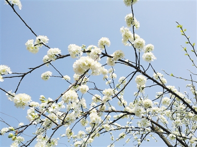 終于,有一天,天氣晴好,我看到路邊的紅葉李已經(jīng)開(kāi)花了。紅葉李的花瓣特別單薄,但是花開(kāi)得密,遠(yuǎn)遠(yuǎn)看上去,就像帶點(diǎn)兒粉紅的云團(tuán)?;ǘ奸_(kāi)了,南山的春天應(yīng)該到來(lái)了吧,我想。