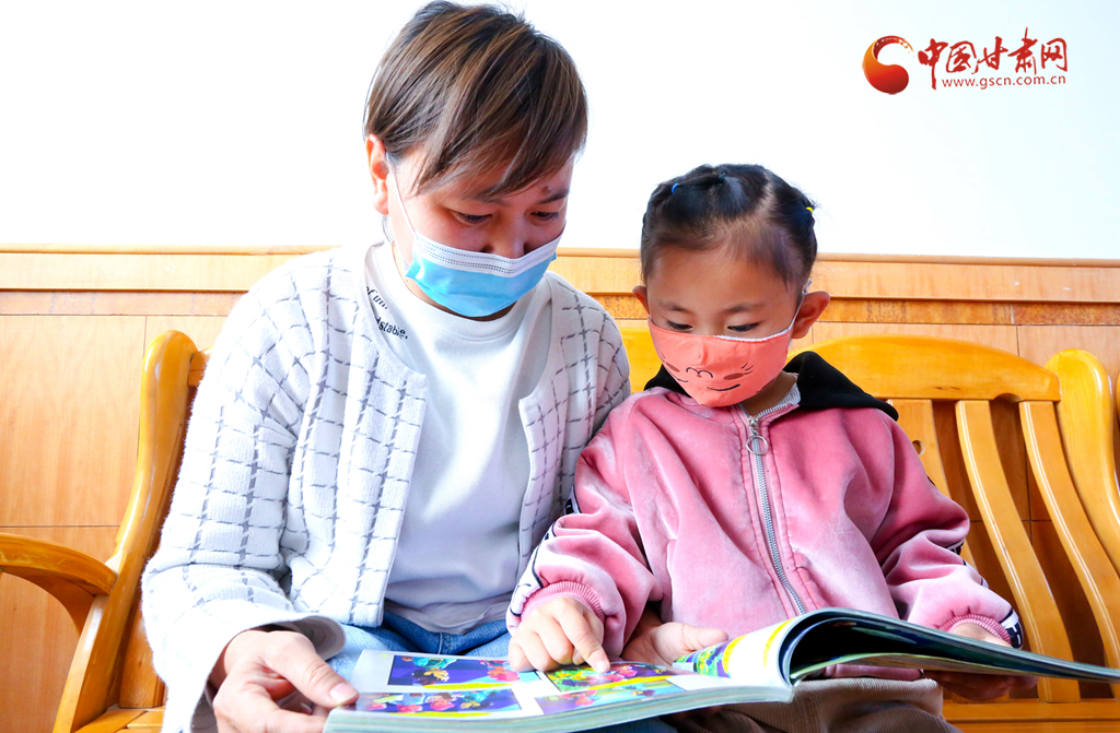 4月21日,甘肅張掖甘州區(qū)火車(chē)站街道下安村農(nóng)家書(shū)屋內(nèi)一名家長(zhǎng)帶著孩子看書(shū)。