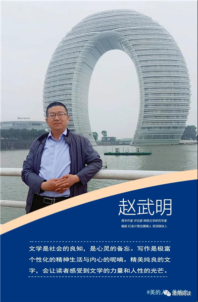 懷瑾握瑜,勤耕不輟。趙武明的寫作是安靜的,由于從事20余年的新聞工作,給他貯存了很多素材,所以他涉獵的寫作范疇很廣,寫散文隨筆、文藝評論、紀錄片、微電影、大型晚會總撰稿,還研究網(wǎng)絡(luò)文學(xué)。如果說文字是會呼吸的,趙武明的文字除了唯美,更多的是硬骨錚錚,也不乏柔腸的峻厲和倬約,風姿獨具,淡雅濃烈,相得益彰,簡約獨立,一語千里,蘊含張力。他常說,寫作要穿透人心抵達靈魂。向外,不斷追求生命更高的境界;向內(nèi),不斷觸及心靈。