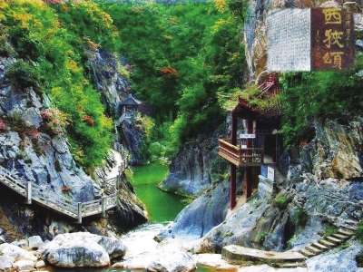 由于路況寬闊平整,從成縣縣城驅(qū)車西行二十分鐘至東入口,便來(lái)到了號(hào)稱青山綠水間的書(shū)法博物館的魚(yú)竅峽,這里就是著名的西狹頌風(fēng)景區(qū)。“光怪靈潭氣欲春,波平浪靜一輪存。鏡連五色龍成彩,珠映千鱗月映痕。”果然,這方寶地清幽綺麗,青山對(duì)峙,澗流清澈。峽內(nèi)的山、水、石、樹(shù),皆成風(fēng)景;亭、橋、廊、榭,相映成趣。舉目環(huán)望,山崖上綠樹(shù)層疊,其間亦或有古樹(shù)參天,老藤纏繞。兩山之間的響水河,或在峽谷中潺潺繞行,或在巨石間沖騰奔瀉,浪花激起的水聲。更美的是懸崖上的水,化成一條白練從高處垂落而下,直泄黃龍?zhí)丁N鲘{飛瀑“龍?zhí)队吃?rdquo;便成為成縣著名的八景之一,至今為世人津津樂(lè)道,贊嘆不已。