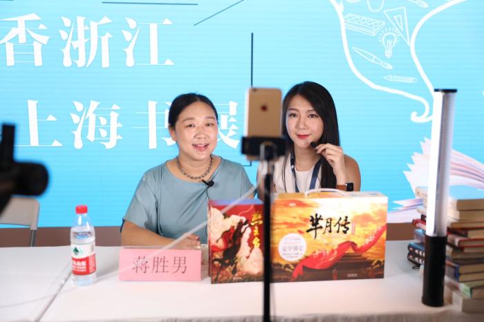 作家蔣勝男在上海書展與網(wǎng)絡(luò)達人直播中。浙江文藝出版社供圖