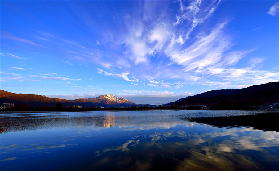 我是被亮光驚醒的。我和很多水從象山腳下的黑龍?zhí)睹俺鰜?。咕咚一聲翻上水面。看見很多不同模樣的人。黑頭發(fā)的人,黃頭發(fā)的人。黑眼睛的人,藍(lán)眼睛的人。我看見了潭邊的亭臺(tái)樓閣??匆娏嘶ㄅc樹。我還順著人們遠(yuǎn)眺的目光看見了玉龍雪山,晶瑩奪目矗立在藍(lán)天下面。潭水映照雪山,真讓人目眩神迷啊。人們?cè)跇蛏?,在堤上,說著不同的語言。在不同的語言里,都有那個(gè)詞頻頻出現(xiàn):麗江,麗江。這時(shí)的麗江已經(jīng)是一座很大的城了。城里也不是只有最初筑城的納西人了。如今全中國全世界的人都要來麗江,看納西古城的四方街,看玉龍雪山。