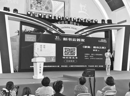 2020上海書展首次啟用了新書“云首發(fā)”的形式。8月15日,在《蒙曼:唐詩(shī)之美》新書“云首發(fā)”現(xiàn)場(chǎng),讀者可以掃描大屏幕上的二維碼進(jìn)行圖書購(gòu)買。