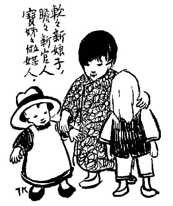 子愷先生藝術(shù)之獨(dú)特在另一方面——獨(dú)樹高標(biāo),表現(xiàn)童心童趣,抒情融入詼諧,展示了一種美學(xué)境界。此類經(jīng)典之作大多收集于《兒童相》。令人過(guò)目不忘者如畫孩子持兩蒲扇,一前一后,作騎馬狀,題曰“瞻瞻的腳踏車”;孩子將自己的鞋子墊于四腳圓凳之下,題曰“阿寶兩只腳,凳子四只腳”。于兒童經(jīng)驗(yàn)之局限寫其心靈之天真,于不起眼的、平常人視之無(wú)所謂的現(xiàn)象中發(fā)現(xiàn)童心之美。還有一幅令人印象深刻,三個(gè)孩子,一女稍高,立于中,左側(cè)男孩,戴英式禮帽,甚大,右側(cè)女孩,頭蒙面布,題曰“軟軟新娘子,瞻瞻新官人,寶姊姊做媒人”。其事極不現(xiàn)實(shí)而孩子極慎重,于兒童顯示童心童趣,于畫則表現(xiàn)了先生的愛(ài)心和幽默。