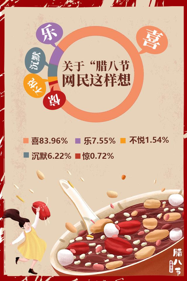 雖然今年多地的臘八節(jié)活動(dòng)因疫情而取消,但是人們對(duì)于團(tuán)圓、祥和、富裕、康寧、平安的期盼從未改變。有關(guān)“臘八”的網(wǎng)民情緒分布中,“喜”占83.96%,“樂(lè)”占7.55%??傮w來(lái)說(shuō),開(kāi)心喜悅的情緒占到了九成以上。