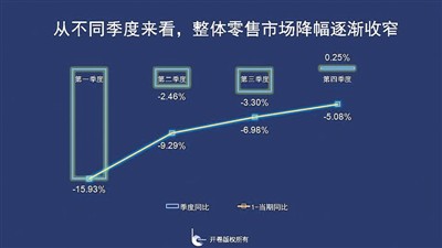 從時間軸來看,整體零售市場第一季度受疫情影響最為嚴重,同比下降15.93%,二季度復工復產(chǎn)復學急速收窄降幅,三季度同比下降3.3%,降幅略增,到第四季度回暖,同比出現(xiàn)小幅上漲,上升了0.25%。