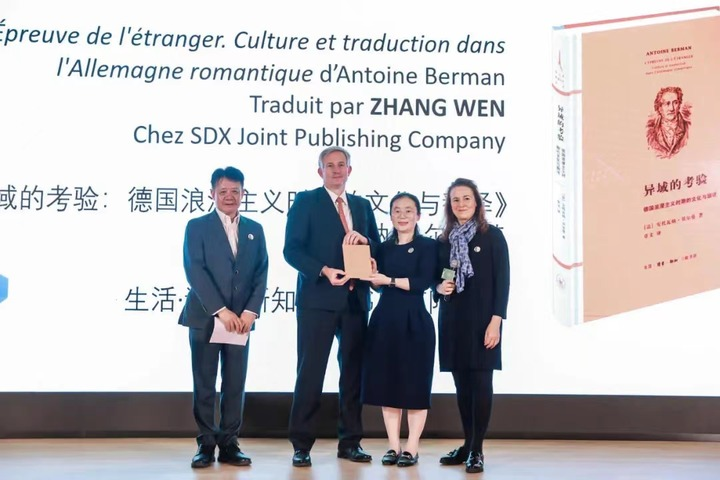 法國駐華大使羅梁(左二)為社科類獲獎譯者頒獎。法國駐上??傤I(lǐng)事館供圖