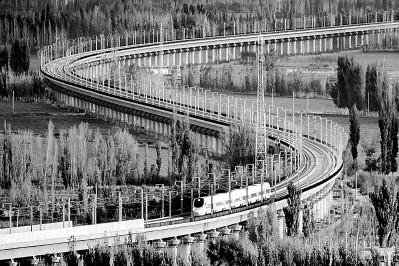 伴隨改革開放大潮,中國發(fā)展日新月異,高鐵、快遞、“天眼”望遠鏡、粵港澳大橋等新事物都被詩人們融入詩行。圖為行駛中的蘭新高鐵列車。新華社發(fā)(蔡增樂攝)
