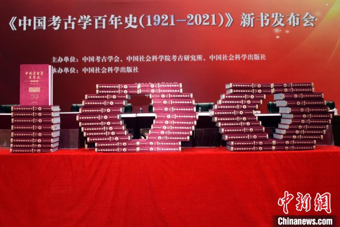 《中國(guó)考古學(xué)百年史(1921-2021)》新書(shū)發(fā)布會(huì)在北京舉行,新書(shū)在會(huì)場(chǎng)擺放成“100”造型?!≈行律缬浾?nbsp;孫自法 攝
