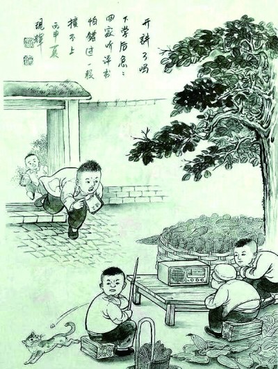 觀賞這一套畫作,好像打開了一整座童年生活的博物館,館藏格外豐富和詳盡,玩耍、上學(xué)、家務(wù)、農(nóng)事、年節(jié),林林總總,堪稱極大程度地再現(xiàn)了童年生活的樣態(tài)形貌。不少畫面還具有頗為鮮明的時代特征,像《派活兒》《滅蝗蟲》《地震棚》《送新兵》《備戰(zhàn)麥?zhǔn)铡贰冻龃蹇措娪啊返鹊龋且环菽莻€年代農(nóng)村社會生活的原生態(tài)寫照,文獻(xiàn)的價(jià)值寄寓在生動的畫面中。