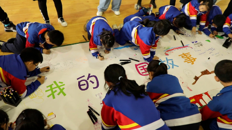 學(xué)生在繪本進(jìn)校園活動(dòng)中手繪畫布“我的中國(guó)故事”