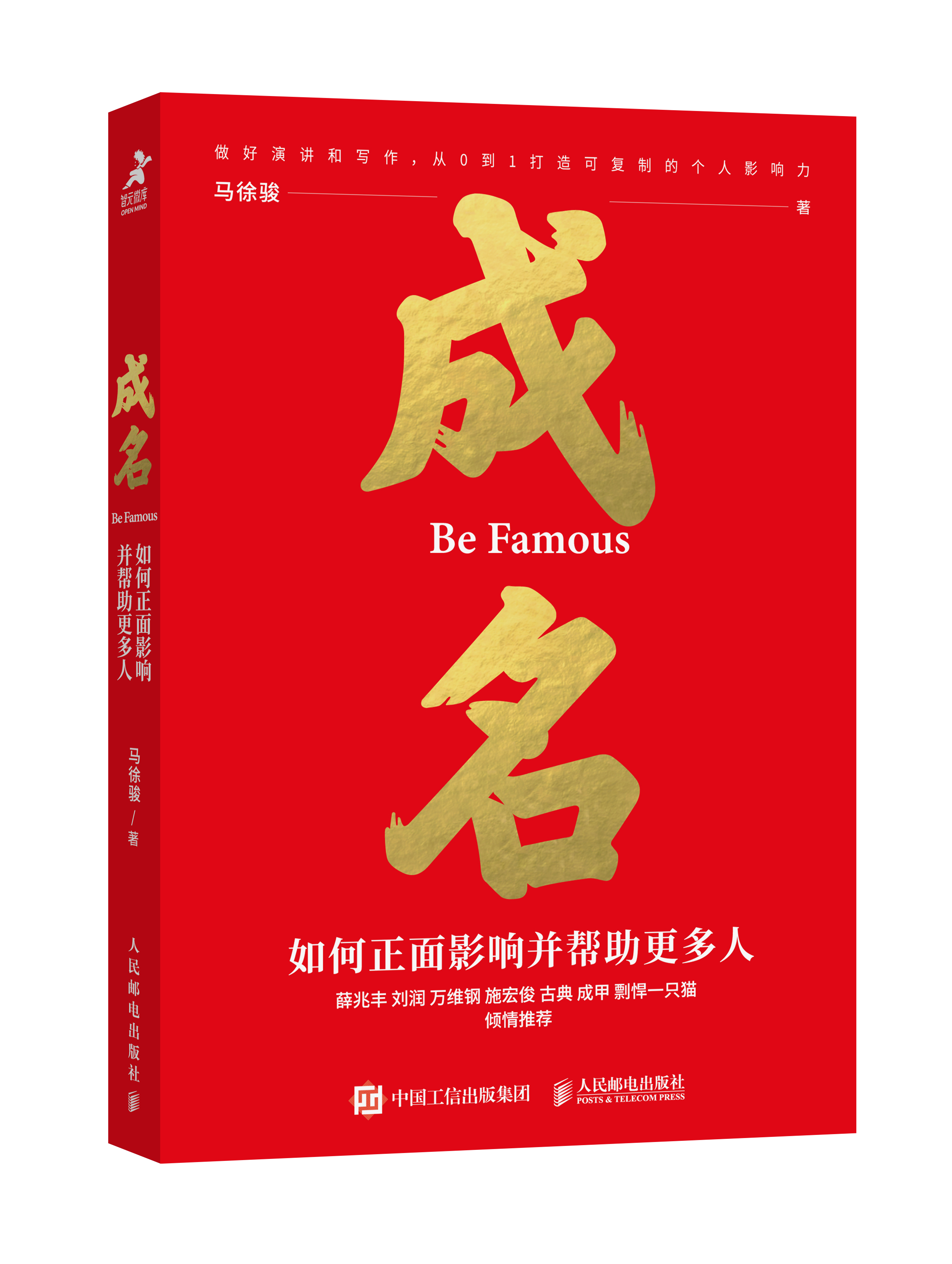 《成名》是一本看得懂、學(xué)得會(huì)、用得上的個(gè)人影響力打造手冊(cè),展示了馬徐駿對(duì)打造好演講、寫(xiě)出好文章的心得和路徑,有助于提升個(gè)人及團(tuán)隊(duì)內(nèi)容造詣,通過(guò)演講、寫(xiě)作放大聲量,正確借助名望正面影響并幫助更多人。
