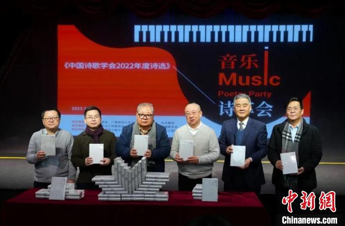 在音樂詩享會(huì)上,著名詩人吉狄馬加等嘉賓共同為《在黎明灰色的山脊上:中國(guó)詩歌學(xué)會(huì)2022年度詩選》出版揭幕。