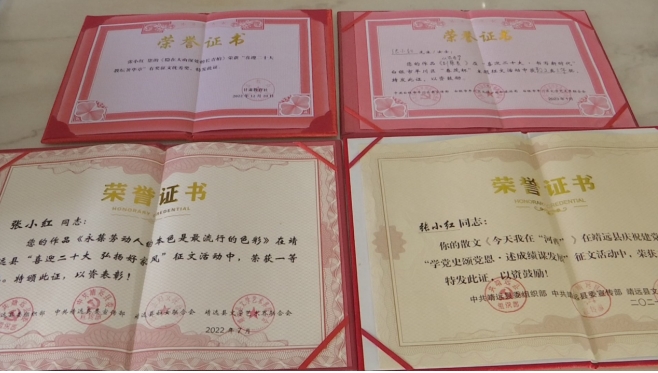 一分耕耘,一分收獲,機(jī)會(huì)總給有心人。如今,張小紅加入了靖遠(yuǎn)縣作家協(xié)會(huì)、白銀市作家協(xié)會(huì)、白銀市文藝評(píng)論家協(xié)會(huì)成為了會(huì)員,也增選為靖遠(yuǎn)縣政協(xié)委員。她的作品散見于《白銀文學(xué)》《烏蘭》等報(bào)刊雜志以及“靖遠(yuǎn)作協(xié)”“隴上風(fēng)情”“黃土情文學(xué)”等文學(xué)公眾號(hào);部分作品榮獲靖遠(yuǎn)縣建黨100周年“學(xué)黨史頌黨恩·述成績(jī)謀發(fā)展”征文二等獎(jiǎng),“喜迎二十大·教壇著華章”《未來(lái)導(dǎo)報(bào)》有獎(jiǎng)?wù)魑膬?yōu)秀獎(jiǎng)等……