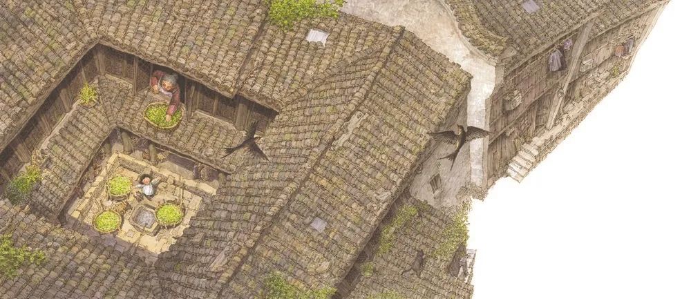 作為中國民居建筑繪本,《外婆家在江南》并不是專門講述江南民居建筑的知識繪本,而是將知識和故事巧妙交融,彌漫著濃郁的人文氛圍,流淌著深厚的情感意蘊。全書的文字構成一篇精美的散文,字斟句酌,凝練雅致,看似輕描淡寫,實則情深意長。作者以小女孩丫丫和外公外婆為主要人物,以行云流水的筆墨鋪展一家人從早到晚的一日生活,同時移步換景地展示江南民居的特色。畫家運用全景、中景和近景的鏡頭有節(jié)奏地進行頁面開合切換,既有整體的宏觀統(tǒng)攝,又有局部的細致凸顯。全書以具有江南特色的蠶事和休閑為線索,自然過渡和連綴起一系列勞動和生活的空間,河流、碼頭、廂房、天井、亭子間、閣樓、正房、店鋪、屋頂、馬頭墻、檐廊、戲臺、石板路……辛勤的日子蔓延于其中,生活的熱情洋溢于其中,溫厚的親情蘊藏于其中,意趣豐盈。