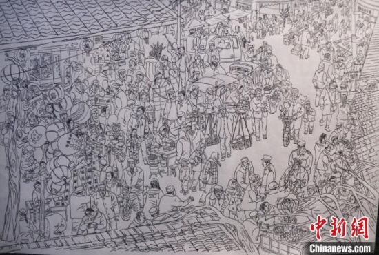 蘭州鋼筆畫愛好者周新平勾勒了數(shù)組關(guān)于鄉(xiāng)村記憶的鋼筆畫,其中,《隴西臘月圖》是他歷時三個多月,手繪了200多村民,完成的一幅舊時農(nóng)民過年趕集的熱鬧圖景:賣糖葫蘆的小販、剪紙賀春的手藝人、趕車挑擔的趕集人……周新平說,他很怕“集市文化”將來被人們遺忘,用鋼筆記錄下來,留住記憶里的“年味”以感悟鄉(xiāng)愁。