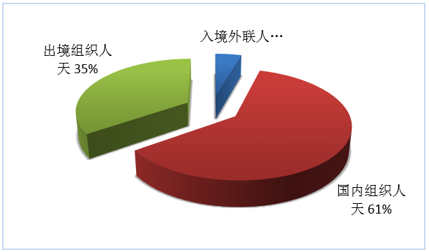 按照入境外聯(lián)人天、國內(nèi)組織人天、出境組織人天三項指標(biāo),入境旅游、國內(nèi)旅游、出境旅游市場人天所占份額依次為4%、61%、35%(見圖7)。