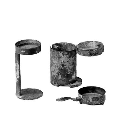 這件青銅鑄造的鼎形燈,收合時為附耳三足蓋鼎,內(nèi)盛燃燈時所用的油料,以子母口扣合。蓋中央為一突起的圓柱狀銎,蓋兩側(cè)為相對的二鴨首,其寬嘴正好銜住雙鍵,鼎蓋便被牢牢扣住。用燈時,將雙鍵支起,可插入鼎蓋中心的圓銎中,鼎蓋即成為燈盞。鼎形燈構(gòu)造精巧,設(shè)計(jì)科學(xué),使用方便,封口嚴(yán)密不溢油,為貴族出行時使用的燈。