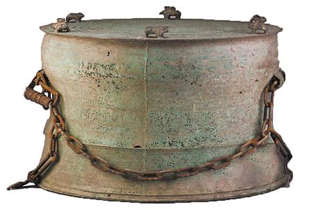 打擊樂器,斜掛的鐘稱之為甬鐘,直懸的鐘稱之為鈕鐘。
