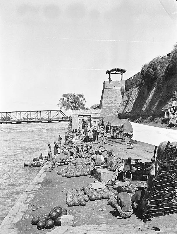 第三張照片,拍攝地點在黃河鐵橋附近,這是一處碼頭,一些人忙碌著卸西瓜,一些人靠著羊皮筏子等著人們渡河。小吃攤打著篷布,三三兩兩的人圍坐在那里,似乎是在吃釀皮子。照片上,遠處是黃河鐵橋,看上去黃河水距離鐵橋的橋面比較近。由此看來,黃河的水量不小。