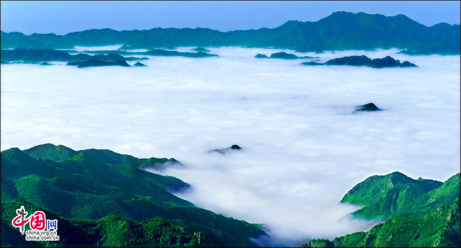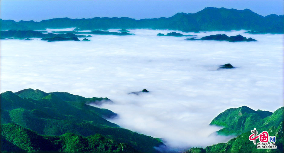 暖濕空氣上升到一定高度,遇冷凝結(jié)成云霧,形成霧靈山變幻莫測、波瀾壯闊的霧靈云海。云海在無風之際是出奇的平靜,輕風吹過,濺起層層浪花。風勢稍強,便似波濤洶涌,又如萬馬奔騰,置身山巔,神思飛越,浮想聯(lián)翩,仿佛進入夢幻世界。站在頂峰遠眺,山巒在云海中出沒無常,宛若大海中的無數(shù)島嶼,時隱時現(xiàn),似真似幻,使人感到一種神奇縹緲的仙境般的美。云海中的景物若隱若現(xiàn),虛虛實實,令觀者捉摸不定,于是產(chǎn)生幽邃、神秘、玄妙之感,給人一種朦朧的美。從美學(xué)角度觀察,霧靈云海妙在似海非海,非海似海。其潔白云霧的飄蕩,使霧靈山呈現(xiàn)出靜中寓動的美感。正是在這種動靜結(jié)合之中,造化出變幻莫測,氣象萬千的人間仙境。